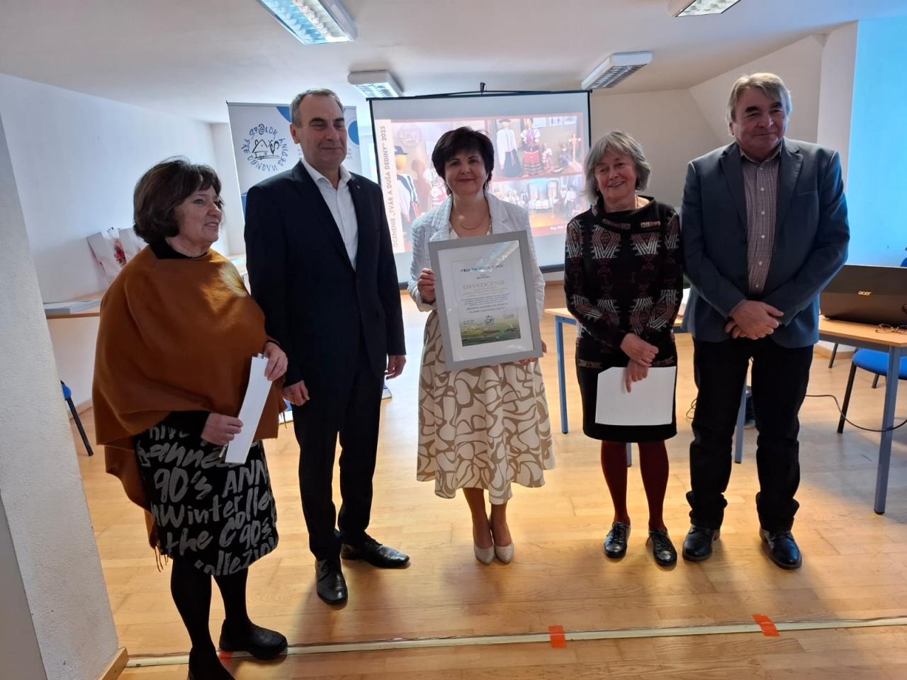 za dodržiavanie dodnes živého dedičstva ľudového odevu jeho sústredením , zatriedením, ochranou, popularizáciou a prezentáciou pre návštevníkov v obnovenom tradičnom dedinskom dome v zrealizovanom projekte